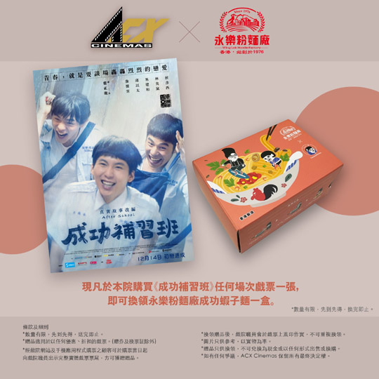 天耀媒體、Kairos與CMN發行的台灣電影《成功補習班》於今天正式上映,上圖所見便是在ACX Cinemas官方Facebook的圖片。電影與ACX Cinemas及永樂粉麵廠合作。觀眾於北角匯ACX Cinemas購買《成功補習班》任何場次戲票一張,即可換領永樂粉麵廠的成功蝦子麵一盒。無論是票房購票或是網上購票,也可以獲得有關的優惠。
