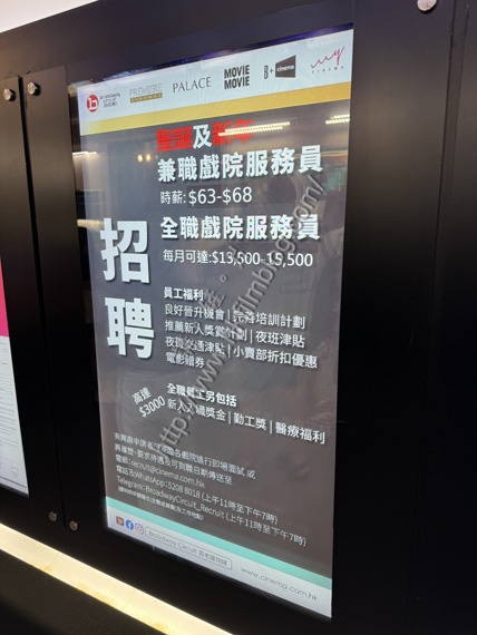 上圖所見,便是「講。鏟。片」情報人員日前於旺角百老匯戲院地下大堂所攝,可以看到在電子海報屏幕,出現了該院線的招聘廣告,當中包括了聖誕及新年的兼職戲院服務員,而時薪可達六十三元至六十八元,比起某院線兼職時薪約五十五元多出超過一成。