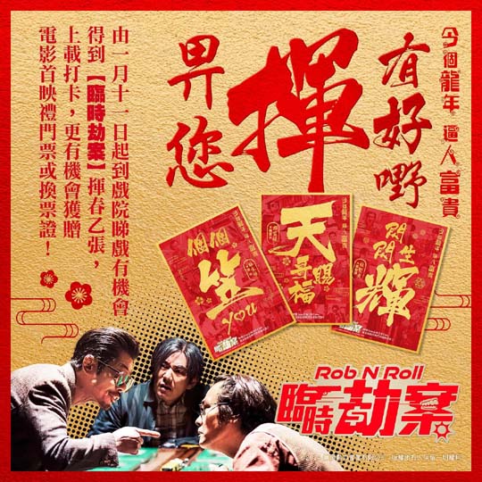 《臨時劫案》將會推出三款揮春,分別以「天哥賜福」、「閃閃生輝」及「個個笠You」 為主題,希望可以利用揮春來配合賀歲的聲勢。而有關的揮春由今天開始,可於全港各大戲院索取,當然不同戲院所發佈的款式或有所不同。另一方面,觀眾拿到《臨時劫案》海報,倘若上傳打卡,亦會有機會獲贈電影首映禮問票或換票證。