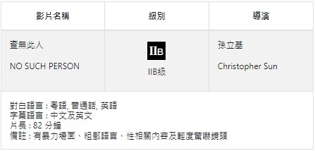 上圖所見,便是一部名為《查無此人》的電影,電影導演為孫立基,電影對白語言為粵語、普通話及英語,字幕為中文及英文,電影片長約82分鐘,並且送檢獲得青少年與兒童不宜的II B級別電影評級,而備註則寫上「有暴力場面、粗鄙語言、性相關內容及輕度驚嚇鏡頭」。
