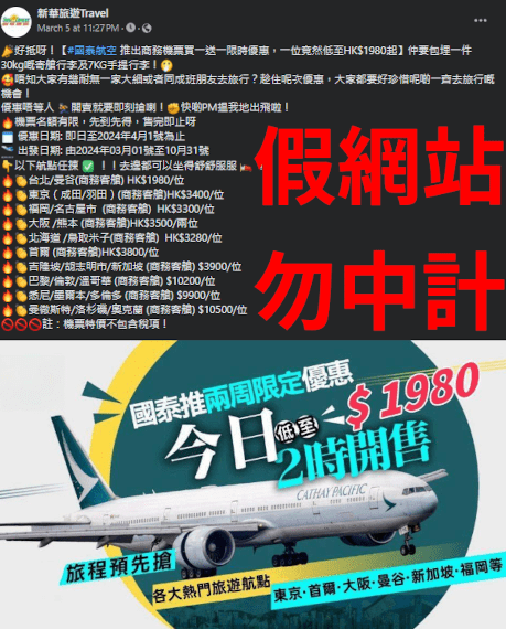 當中要說是假原因很多,其中一個就是這個專頁根本沒有新華旅遊的官方連結,連結的東西與賬戶已很假。而且,國泰艙空近期雖然已有提供「尊尚逍遙通」套票價惠,但是兩程日本來回也要一萬七千多,還從來不會來買一送一。