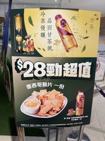 上圖所見,便是「講。鏟。片」情報人員日前於九灣站德福廣場的MCL德福戲院大堂近入場處所攝,該戲院為宣傳淳茶舍的茶飲,於是推出了優惠,當中觀眾可以用二十八元來購買一客墨西哥脆片,還送一枝五百毫升無糖冷萃台灣蜜香紅茶。