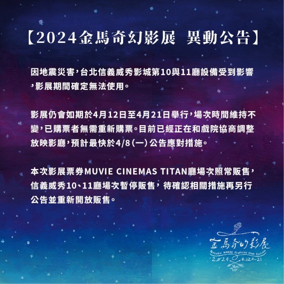 金馬奇幻影展於今天發佈了公告,指受到地震影響,金馬奇幻影展放映場地台北信義威秀影城第十廳與第十一廳設備受到影響,將不能於影展期間使用。而影展方面表示是次節期四月十二日至四月二十一日如期舉行,而場次時間亦維持不變,故此已購票人士不用再購票。