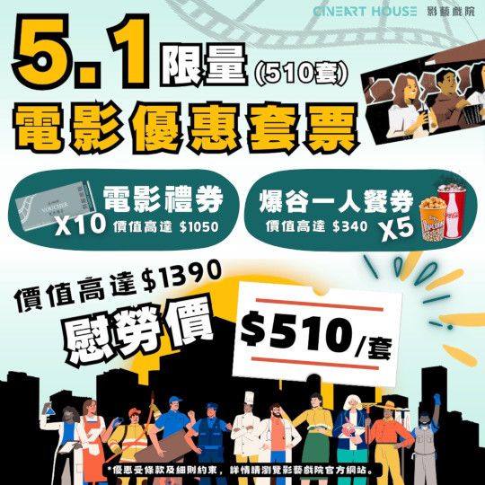上圖所見,便是影藝戲院的最新公佈,該戲院將於五月一日勞動節推出限量電影套票。是的限量電影套票包括了十張電影祥券與五套爆谷一人餐券。當中以最高的價值計算,總價值高達1,390元,而在五月一日則以每套510元出售。