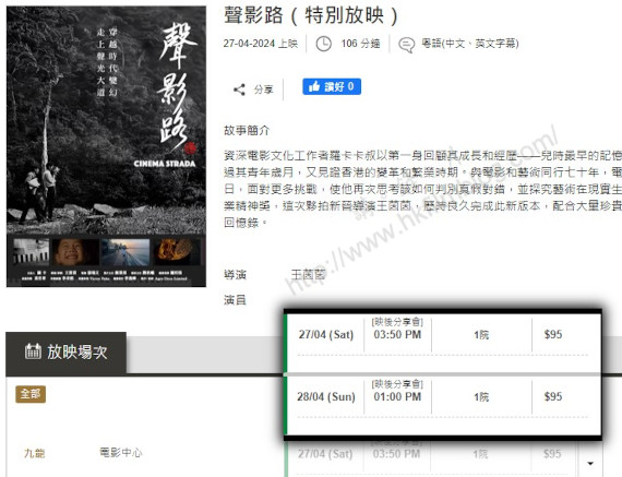 上圖所見,便是來自百老匯院線網站的截圖,可以看到《聲影路》將會於本月底安排兩場放映當中包括四月二十七日星期六下午三時五十分,以及四月二十八日星期日下午一時正,兩場放映均在百老匯電影中心舉行,而兩場戲票亦已經開售。