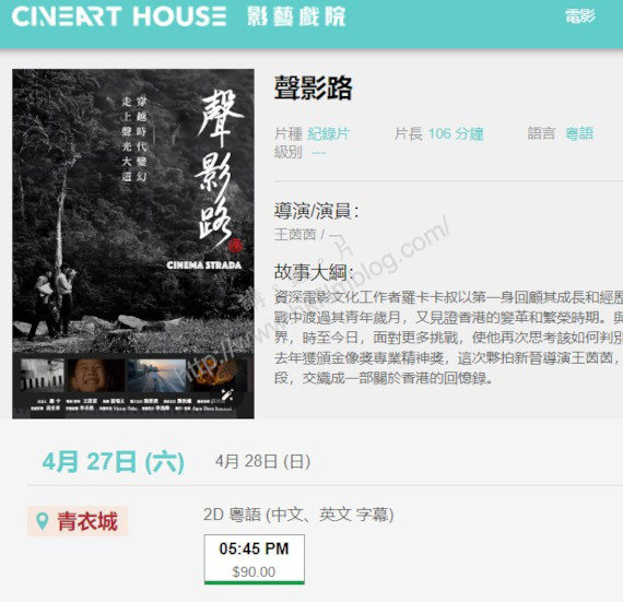 「講。鏟。片」日前曾經報導,王茵茵執導,以香港電影文作者羅卡先生為主題的《聲影路》將於本月底在百老匯電影中心放映兩場特別放映。然而,特別放映的戲院亦不止一家,當中位於青衣城的影藝戲院也會提供限量放映。