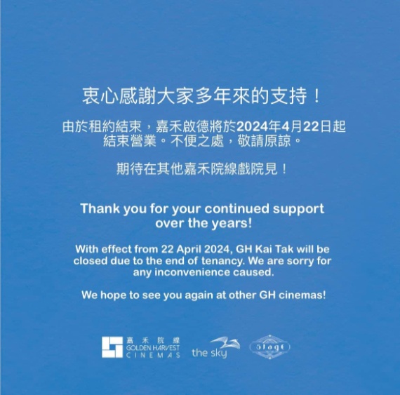 上圖所見,便是嘉禾院線在其官方網站的圖片,當中位於新蒲崗越秀廣場的嘉禾啟德因為租約期滿,將於四月二十二日起最後營業,也意味著在參與本周日全港戲院日後隨即結業。