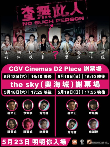 嘉樂與UPTV發行、孫立基執導,鄒文正、余凱祺、黃定謙、陳善渝、陳穎妮、李濰靜、黎紀君、鍾嘉駿、張松枝等主演的《查無此人》將於五月二十三日在港上映。而電影繼上周舉行首映後,將會於今天與明天舉行優先場。