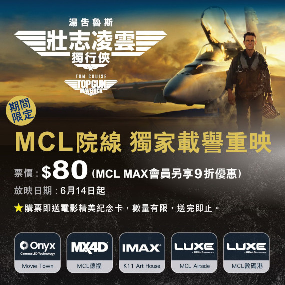 上圖所見,便是MCL院線近的通告,顯示該院線將於六月十四日起限量重映洲立發行、湯告魯斯主演的派拉蒙電影《壯志凌雲:獨行俠》。而是次重映為MCL獨家,票價為八十元,而MCL MAX會員則可享九折優惠,並且提供精美紀念咭。當然,這些紀念咭也是限量供應,送完即止。