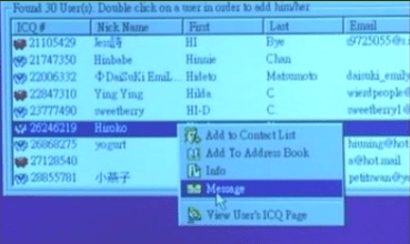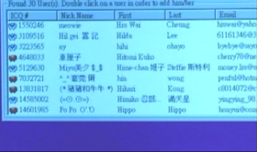至於搜尋結果,可以看到名字之餘,還會看到電郵地,前方則有ICQ編號。而ICQ最初的編號為六位數字,漸漸變成七位、八位甚至九位。