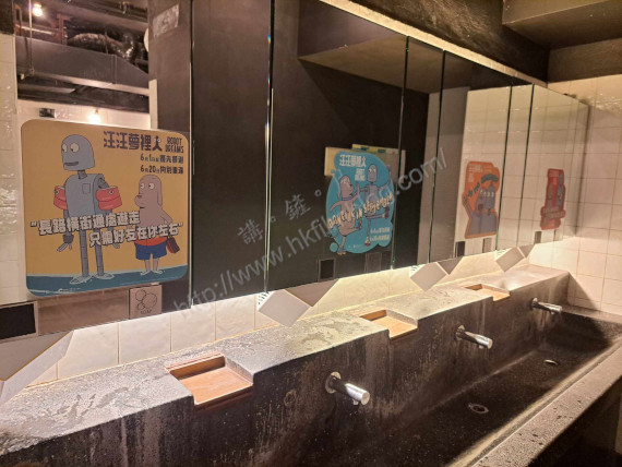 上圖所見,便是「講。鏟。片」讀者日前於油麻地百老匯電影中心所攝,可以看到在其一樓男洗手間鏡櫃的位置,貼上了幾款由安樂發行、六月二十日上映的動畫電影《汪汪夢裡人》的宣傳品,可以看到片中機械人與狗之間的不同造型,由於造型相當可愛,也吸引了不少觀眾的注意。
