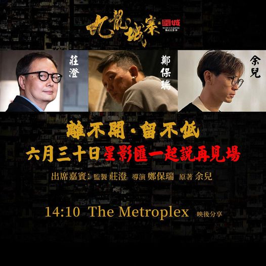 另一方面,星影匯亦特別安排當天下午二時十分《九龍城寨之圍城》場次作映後分享,出席者包括監製莊澄、導演鄭保瑞與原著余兒,並且以「星影匯一起說再見場」作主題,而該場已售出大部分戲票,有意出席該出次的觀眾,也許需把握機會從速購票好了。