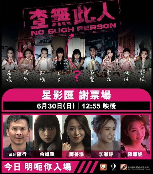 上圖所見,便是嘉樂與Up Media發行、孫立基執導的《查無此人》,該片特別安排於六月三十日星期日在下午十二時五十五分場次作映後謝票,當中謝票陣容包括了編劇陳行、演員余凱祺、陳善渝、李濰靜與陳穎妮。