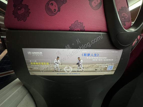 上圖所見,便是「講。鏟。片」讀者在乘搭九巴時於上層座椅所攝,可以看到座椅的椅背張貼了由聯合國難民署主辦,於六月十四日至七月七日舉行的第七屆慈善難民電影節宣傳。宣傳貼紙共有兩款,其中一款以電影《讓我們酒在一起》作主題。