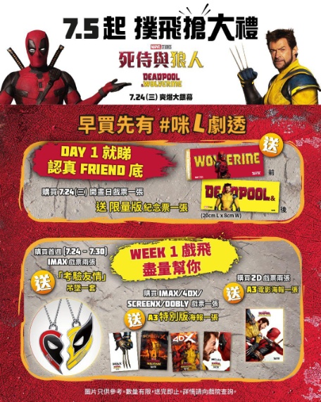 迪士尼發行的Marvel電影《死侍與狼人》將於七月二十四日在港上映,並且安排於今天起開始預售。部分院線如Cinema City與嘉禾院線在開售一事較為低調。相比之下,英皇戲院似乎對此來得相當積極。當中於昨晚宣佈在今天傍晚六時開始發售於尖沙咀iSquare英皇戲院的IMAX影廳場次,並且同時宣佈推出特典場。