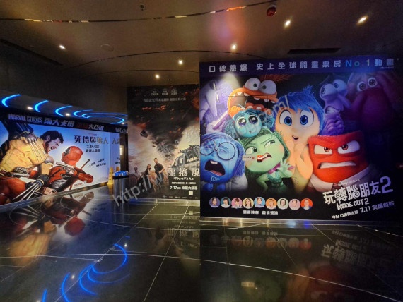 上圖所見,便是「講。鏟。片情報人員日前於旺角Cinema City朗豪坊八樓戲院所攝,可以看到該戲院八樓大堂的牆身,分別披上了三部不同的荷里活電影,當中包括將於七月十一日上映由迪士尼發行的彼思動畫《玩轉腦朋友2》、環球發行於七月十三日上映的電影《龍捲風》,以及迪士尼發行將於七月二十四日上映的Marvel電影《死侍與狼人》。