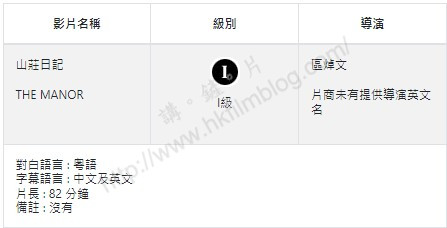 翻查負責電影檢查的電影、報刊及物品管理辦事處的紀錄,一部名為《山莊日記》的電影已完成送檢,電影導演為區焯文、對白語言為粵語,並且配有中文與英文,電影片長為八十二分鐘,並且獲評為適合任何年齡人士觀看的一級。