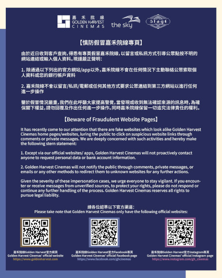 上圖所見,便是嘉禾院線在其官方Facebook專頁張貼了通告,提醒觀眾慎防嘉禾院線網頁,當中指出嘉禾院線不會在任何情況下主動聯絡公眾索取個人資料或銀行賬戶資料。與此同時,也會透過任何方式要求公眾連續至第三方網站作任何操作。同時嘉禾院線在聲明也貼上官方網站、Facebook專頁與Instagram專頁的二維碼。