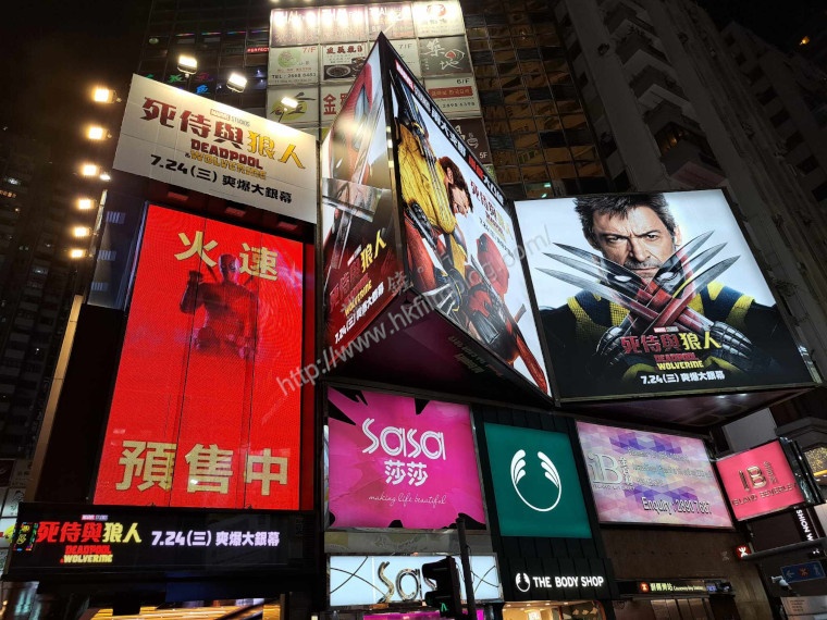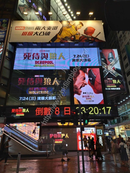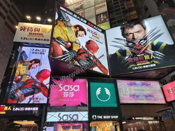 迪士尼發行的Marvel電影《死侍與狼人》將於七月二十四日星期三在港上映。上圖所見,便是「講。鏟。片」情報人員於銅鑼灣東角道金百利商場外所攝,可以看到整個位置仿如成為了電影《死侍與狼人》的宣傳專區。