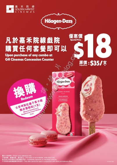 上圖所見,便是嘉禾戲院在其官方Facebook專頁張貼的圖片,觀眾凡於嘉禾院線戲院購買任何套餐的話,就可以換購Haagen-Dazs士多啤梨紅桑子馬卡龍脆皮雪糕批一支,而換購優惠價為十八元,比起原價三十五元,可算是接近半價。