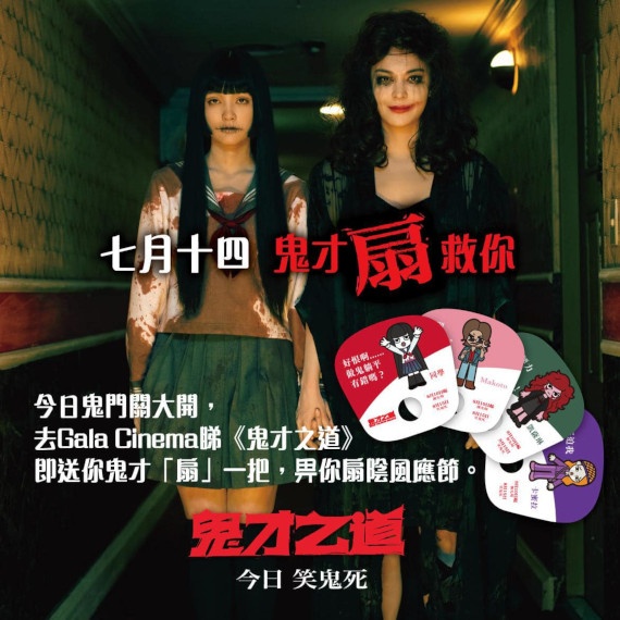 上圖所見,便是百老匯院線在今天張貼的圖片,當日寫上「七月十四,鬼才扇救你」為宣傳。觀眾於今天到旺角朗豪坊的Gala Cinema觀看電影《鬼才之道》,便可以獲得鬼才「扇」一把,用來扇一點陰風去應節一下。