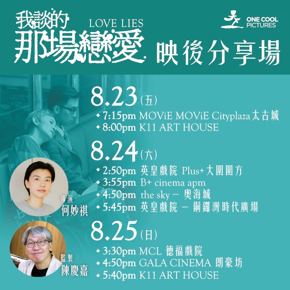 《我談的那場戀愛》映後分享場次出席嘉賓包括了監製陳慶嘉與導演何妙祺,當中八月廿二日星期五晚上安排於太古城MOViE MOViE Cityplaza及尖東站K11 Art House場次,八月廿四日星期六則安排於大圍圍方英皇戲院Plus+、觀塘B+ cinema apm、奧海城The Sky及銅鑼灣時仢廣場英皇戲院各有一場下午場次,而八月廿五日星期日則安排在九龍灣MCL德福、旺角Gala Cinema及尖東站K11 Art House的下午場次作映後分享。