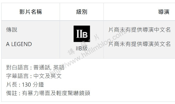 翻查負責電影檢查的電影、報刊及物品管理辦事處的紀錄,電影《傳說》已於本月完成送檢。電影對白語言為普通話與英語,字幕語言為中文及英文,片長為130分鐘,並且因有暴力場面及輕度驚嚇鏡頭,而被評為青少年與兒童不宜的II B級別。