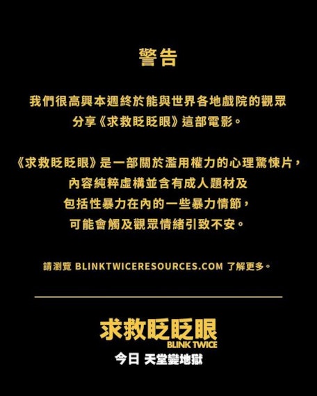 環球發行的華納電影《求救眨眨眼》剛於周四在香港上映。而電影公司則特別發出了警告,指出電影屬於一部關於濫用權力的心理驚慄片,內容包括成人題材,也包括性暴力的情節,可能會觸及觀眾情緒引致不安。