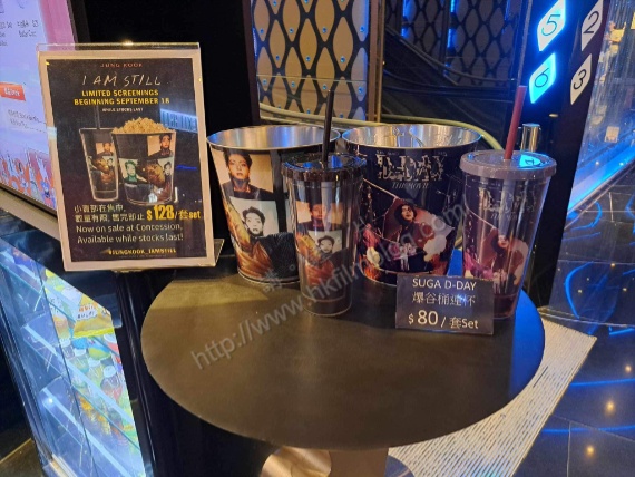 上圖所見,便是「講。鏟。片」情報人員日前於旺角朗豪坊Gala Cinema八檈大堂小食部旁所攝,可以看到該戲院推出了兩款爆谷桶連杯的套裝,其中一款為Suga D-Day,每套承惠八十元。而另一款則街著《Jung Kook: I Am Still》而推出,而每套更是需要128元,價錢更是高於部分電影爆谷桶連杯的套裝。