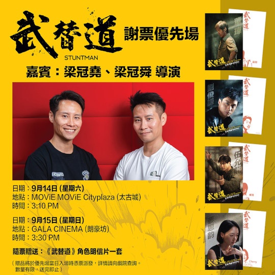 謝票優先場場次分別為九月十四日星期六下午三時十分太古城MOViE MOViE Cityplaza場次,以及九月十五日星期日下午三時半旺角朗豪坊Gala Cinema場次,屆時兩位導演梁冠堯與梁冠舜將會出席謝票環節,而入場觀眾將獲贈電影《武替道》角色明信片一套。而兩場謝票優先場的戲票已在上映戲院票房、百老匯院線網站及手機應用程式發售。有意先睹為快的觀眾,敬請把握機會從速購票好了。