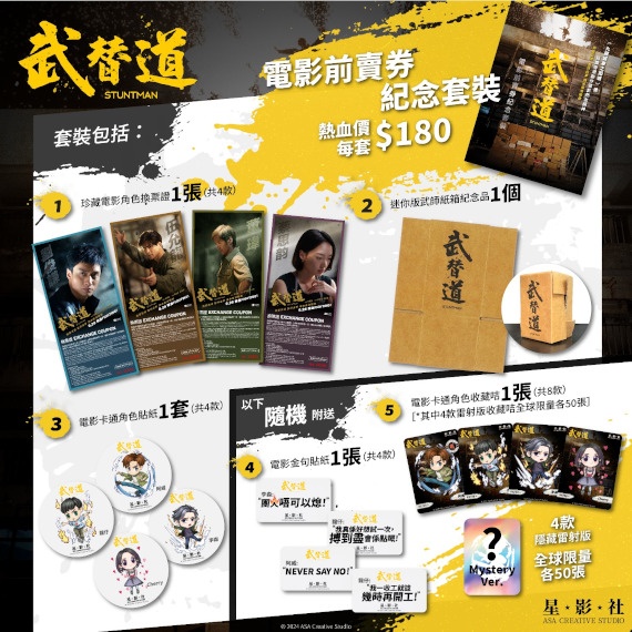 安樂發行、陳羅超監製、梁冠堯與梁冠舜合導,董瑋、劉俊謙、伍允龍及蔡思韵主演以動作演員為主題的影《武替道》將於九月二十六日在港上映。而安樂發行亦為該片推出了前賣券套裝,而套裝包括以下禮品: