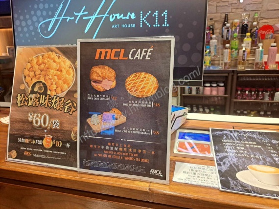 至於右方則以「MCL Cafe」之名推出了不同款式小食,當中包括四十二元的芝士火腿牛角包、四十八元的香焗雞肉蘑菇批,以及兩件三十八元的英式鬆餅配忌廉,三款食品均可以半價加配啡咖或川寧茶一杯。未知道大家日後光臨K11 Art House時,又會否嘗試這些款式的小食呢?