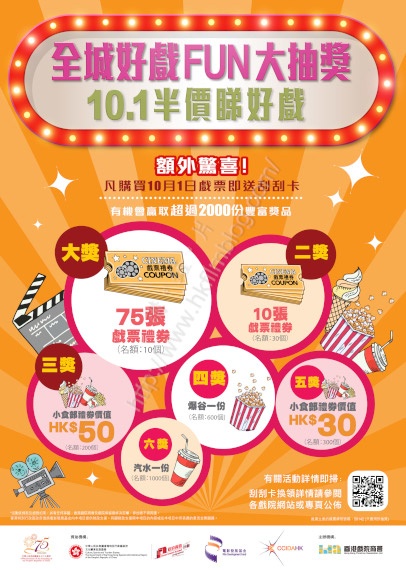 至於刮刮卡方面,正式名稱為「全城好戲FUN大抽獎」,卡上印有不同的電影對白可留為紀念。而是次獎品超過二千份,除了昨天公佈大獎十位各獲75張戲票禮券、二獎30位各獲十張戲票禮券外,還公佈了三獎200位各獲小食部50元禮券、四獎600位各獲爆谷一份、五獎300位各獲小食部30元禮券,而六獎一千位各獲汽水一杯。大獎及二獎需於十月十一日或之前以電郵或電話登記安排領獎。三獎至六獎則可到除新光及寶石戲院外的戲院領獎,有效期至十月底。