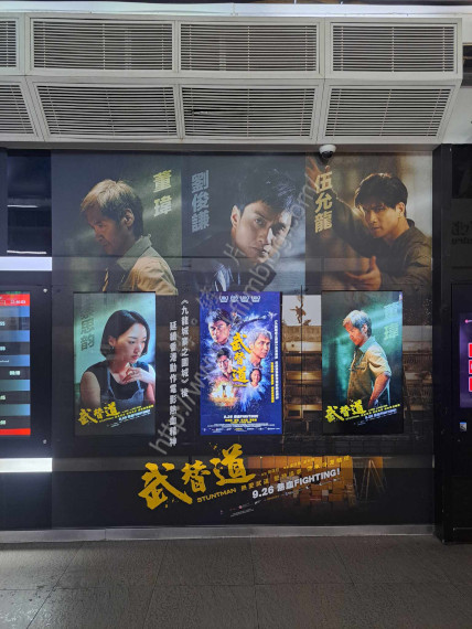 上圖所見,便是「講。鏟。片」情報人員日前於旺角百老匯戲院大堂所攝,可以看到該戲院地下大堂近自助取票機的位置,成了電影《武替道》的宣傳專區,可以看到宣傳品用上了戲院的三個電子屏幕位置,上方分別以三位男主角董瑋、劉俊謙及伍允龍為主體,下方則寫上了片名及映期。
