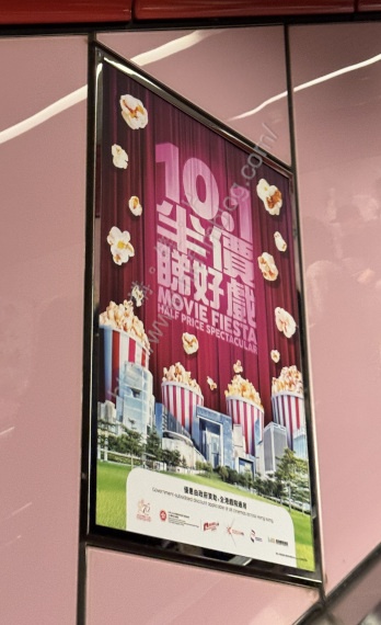 上圖所見,便是「講。鏟。片」情報人員日前於港鐵太古站連接車站大堂與康怡廣場之間的扶手電梯所攝,可以看到在扶手電梯旁的平面廣告位置,張貼了「10.1半價睇好戲」的宣傳品。當中背景仿如是戲院的銀幕,然後有著四杯爆谷,而前方則有政府總部的建築。