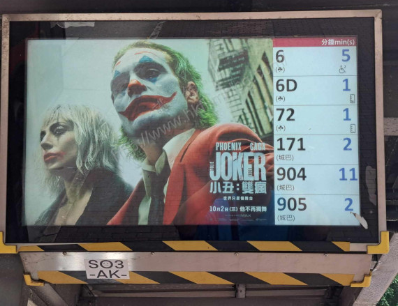 環球發行的華納電影《小丑:雙瘋》將於十月二日星期三在港上映,而上圖所見,便是「講。鏟。片」情報人員於深水埗區的其中一個巴士站所攝,可以看到巴士站顯示各路線到站時間的電視屏幕的左方,換成了電影《小丑:雙瘋》的宣傳。
