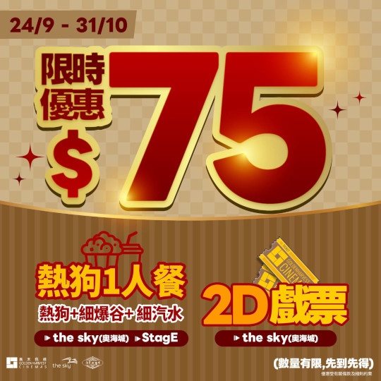 上圖所見,便是嘉禾院線在其官方Facebook專頁的圖片,可以看到該院線聯同S* Rewards提供國慶75週年限定活動,活動期由九月二十四日至十月三十一日。當中第一項優惠於奧海城The Sky及屯門市廣場StagE推出,S* Rewards會員可以七十五元購買熱狗餐,包括熱狗一隻、細汽水一杯及細爆谷一份,兩間戲院各限量150份,售完即止。