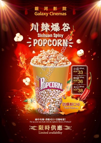 上圖所見,便是位於澳門的銀河影院在其官方Facebook的截圖,可以看到該戲院推出了川辣爆谷的款式,並且以「勁爆新口味」作為賣點,同時指出屬於「麻中有辣,香脆可口,弔爆味蕾」以作宣傳,而這款爆谷口味亦屬於限時供應。