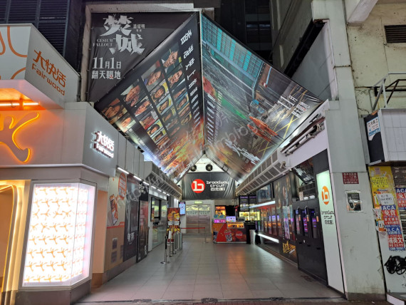 上圖所見,便是「講。鏟。片」情報人員近期於旺角西洋菜南街旺角百老匯戲院地下大堂所攝,可以看到該戲院地下堂的天幕,以舖天蓋地成為了電影《焚城》的宣傳專區。