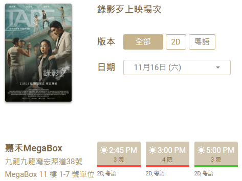 上圖所見,便是來自嘉禾院線的截圖,據了解該片於十一月十六日首場開場的下午三時正四院場次已全院滿座,而早前加開同日下午二時四十五分三院場次僅餘下首行座位,而有關方面亦於今天加開了十一月十六日星期六下午五時正三院場次,而這場新增場次已在嘉禾MegaBox票房、嘉禾院線官方網站及手機應用程式發售。