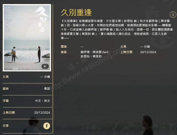 從Cinema City的官方網站所見,即將上映的片目出現了影《久別重逢》,電影演員陣容包括了鄭伊健、陳卓賢、許恩怡與蔡思韵,而上映日期則上了十二月二十日,可算是曾部確定於今年聖誕檔期上映的港產電影。