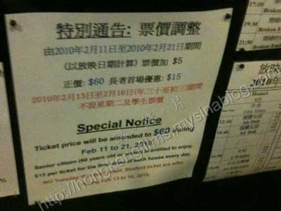 當全球其他地區甚少在特定節目在收費假期票房再加收徵費之時,香港各院線院商卻「先行一步」,每每喜歡在大時大節將票價上調。繼日前百老匯院線公佈於新春期間將票價上調五至十元後,其實三條院線未知是否「乘時而起」還是不甘後人,都在農曆年期間收取「特別價」,在大家新春利是未到手之時,先來向觀眾發個「新年財」。