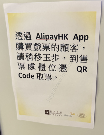 上圖所見,便是「講。鏟。片」情報人員日前於九龍灣嘉禾MegaBox戲院所攝,可以看到該戲院貼上通告,指透過AlipayHK手機應用程式購票的觀眾,不能直接使用二維碼取票,要到票房取票。
