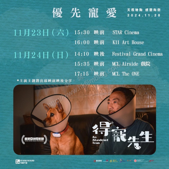 《得寵先生》於本周末共設有五場優先場,當中十一月二十三日星期六安排兩場優先場,包括下午三時半將軍澳站Star Cinema場次,以及下午四時正尖東站K11 Art House場次。至於十一月二十四日則包括九龍塘Festival Grand Cinema下午二時十分場次、啟德站MCL Airside下午三時三十五分場次,以及尖沙咀MCL The ONE下午五時十五分場次共三場。