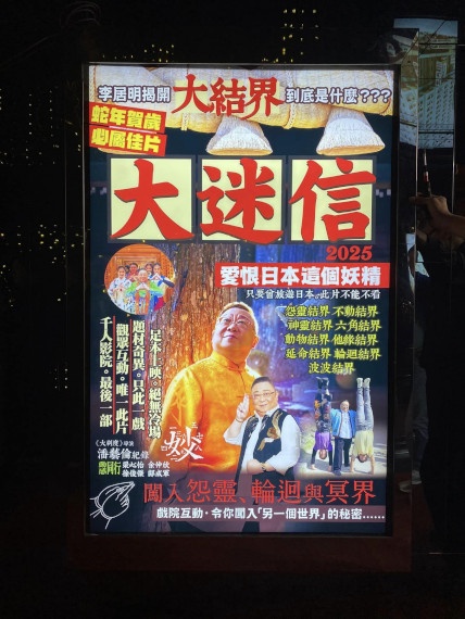 而從「潮爆開運王」Facebook專頁的圖片所見,可以看到在新光數碼影院進場後有另一款《大迷信2025》海報。當中有多個字眼,如「李居明揭開大結界到底是什麼?」、「蛇年賀歲必屬佳片」、「愛恨日本這個妖精」,還有「千人影院最後一部」等。