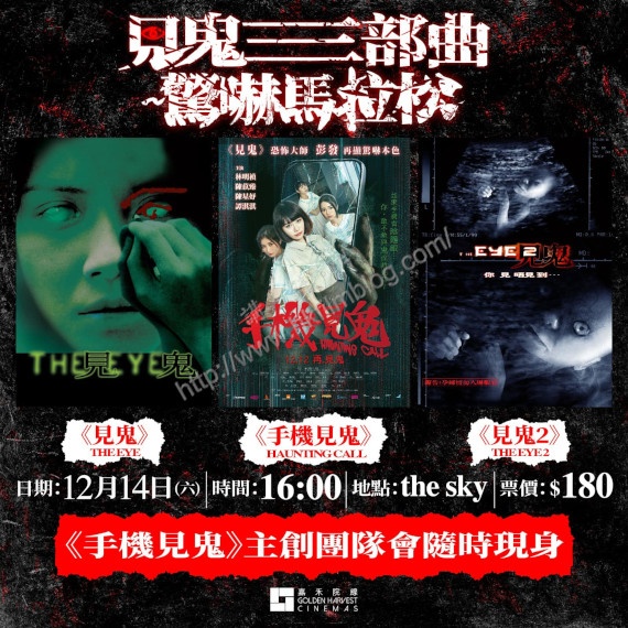 「《見鬼三部曲》驚嚇馬拉松」活動將於十二月十四日星期六下午四時正於奧海城二期The Sky舉行,套票票價為港幣一百八十元,而每場放映之間會有約十五鐘中場休息,而電影《手機見鬼》主創團隊更會隨時現身。有關場次的戲票已於The Sky票房、嘉禾院線網站及手機應用程式發售。有意一氣呵成看三部《見鬼》電影的觀眾,敬請把握機會好了。