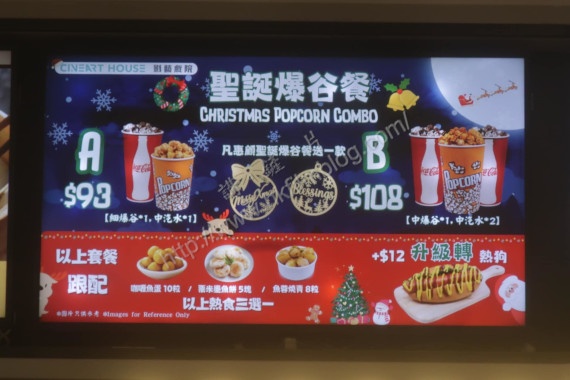 上圖所見,便是「講。鏟。片」情報人員日前於青衣城影藝戲院所攝,可以看到影藝戲院推出了「聖誕爆谷餐」,當中亦分為A款與B款兩款,當中A款包括了細爆谷一客與中汽水一杯,而B款則包括中爆谷一客與中汽水兩杯,而兩款套餐亦同時提供熱食,觀眾可選咖喱魚蛋十粒、粟米墨魚餅五塊或魚蓉燒賣八粒,亦可以選擇加十二元升級轉為熱狗。