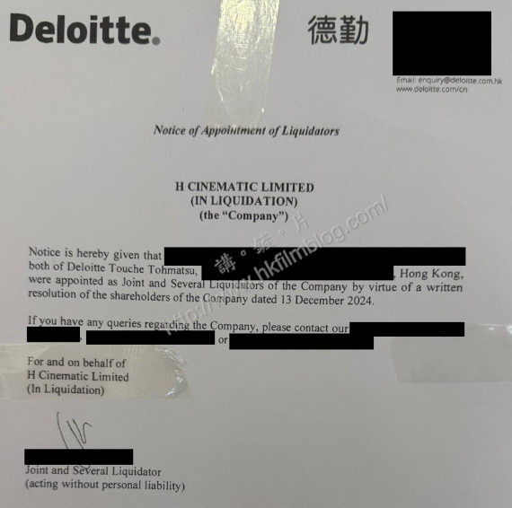 然而較為特別的,就是在閘口左方張貼了一張由德勤會計師事務所的通告,指出該公司已被H Cinematic Limited於十二月十三日委任為自動清盤的清盤人。