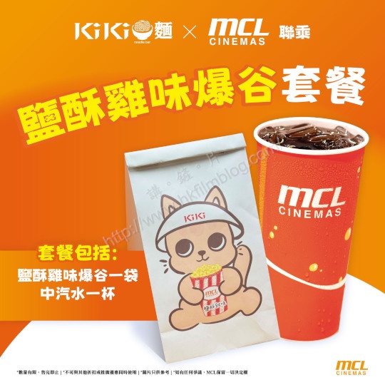 上圖所見,便是MCL院線在其官方Facebook所見,可以看到該院線跟Kiki麵合作,推出了鹽酥雞味爆谷,而爆谷以袋裝包裝,當中套餐可以配上汽水或是Kiki茶。然而,在其官方Facebook並未有標明套餐或單售售價。