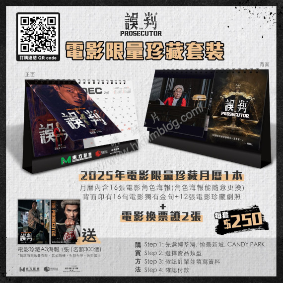 東方影業出品兼發行、甄子丹執導兼主演的《誤判》已在港上映差不多兩個星期的時間,而上圖所見,便是該片於2025年推出的「電影限量珍藏套餐」,套裝包括了一本「2025年電影限量珍藏月曆」,當中包括電影角色海報及金句,同時亦有電影換票證兩張。當中首三百位更可獲得珍藏A3海報一張,款式隨機。